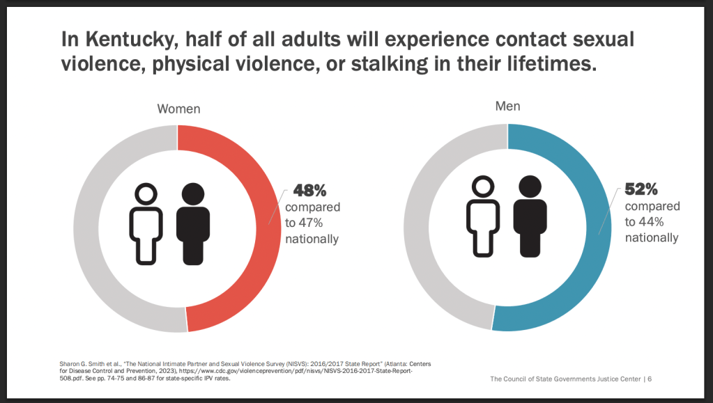 Kentucky has higher rates of domestic violence than the national average: 48% of Kentucky women will experience intimate partner violence or stalking, compared with 47% nationally. About 52% of men in Kentucky will also experience this, which is higher than the national percentage of 44%, according to the center’s data.