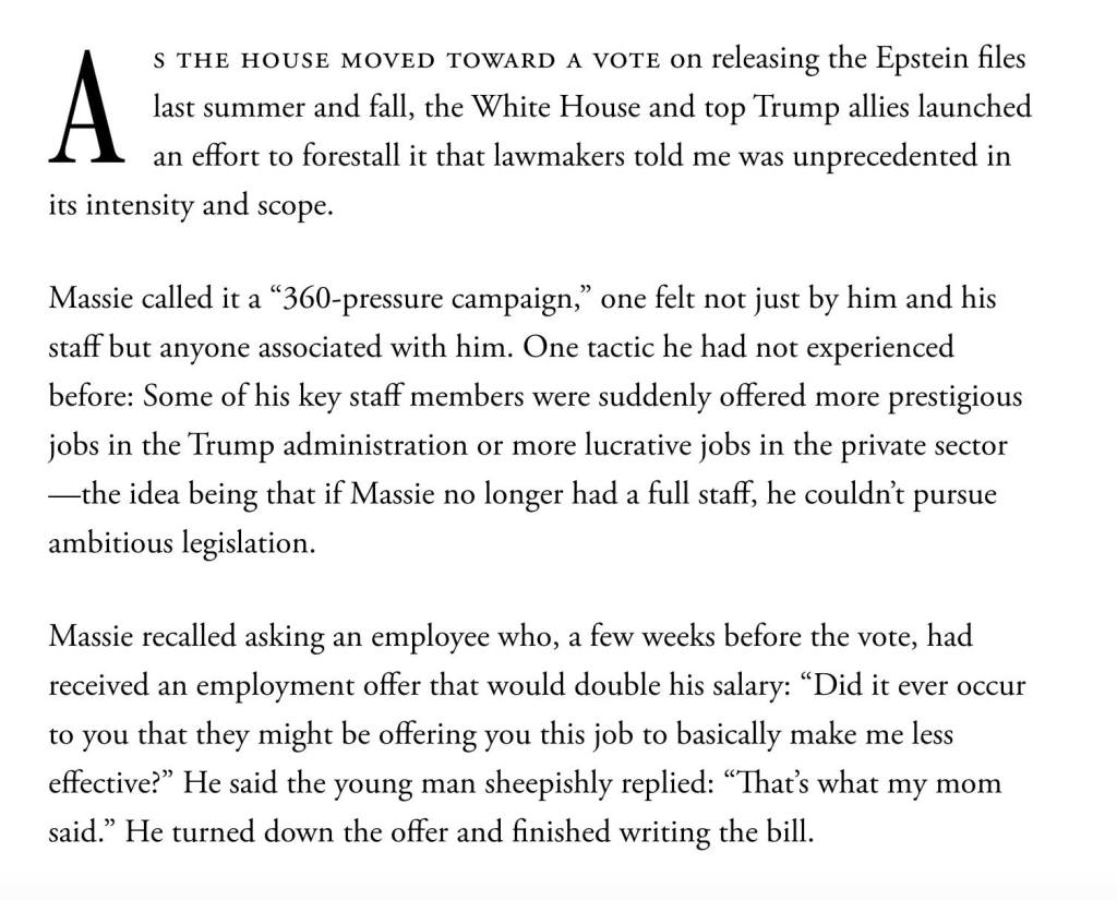 So, given that, the current administration and its billionaire backers have decided to use their money to stifle Massie’s investigation. Here’s The Atlantic:
