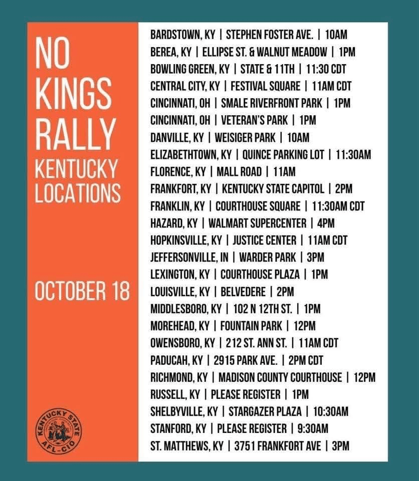 Here’s a list of No Kings rallies on Saturday in and near Kentucky. Maybe you’ll see each other there? (I’ll be out West.)